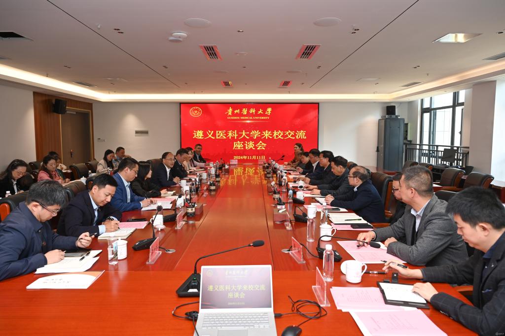 何志旭对刘建国一行莅临学校指导表示热烈欢迎,他表示,遵义医科大学有深厚的历史底蕴、扎实的办学基础,近年来在人才培养、学科建设、医疗服务等方面取得了一系列标志性成果,为贵州医疗卫生事业的发展做了贡献。希望两校进一步加强交流和深化合作,实现优势互补、资源共享,携手推动卓越医学人才培养、重大平台建设和科研创新发展,服务地方经济社会发展,打造省属高校共建共赢合作典范。